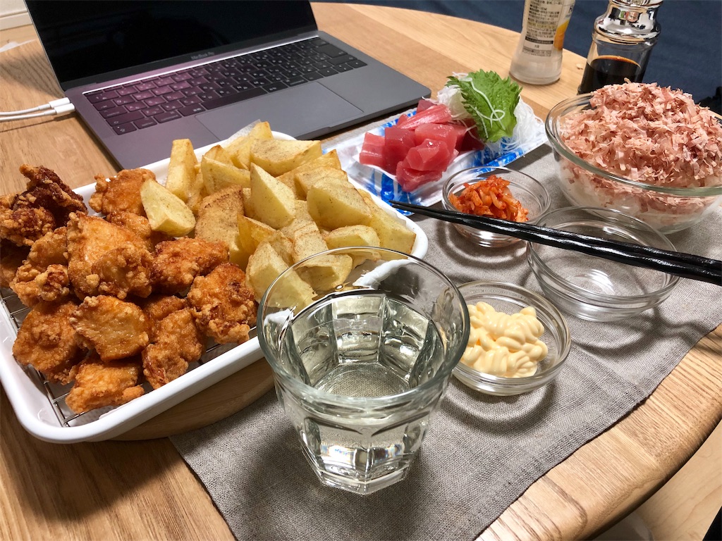 2019-04-19 唐揚げ 晩酌 今週は朝から晩まで狂った様に忙しく、休肝日が続いた… 今日は休日出勤の代休、ようやく飲める… 日中は殆ど布団の中でダラダラ過ごし、日が暮れたら現実逃避開始… 一口目の日本酒が身体に染み渡っていく… 旨い…。