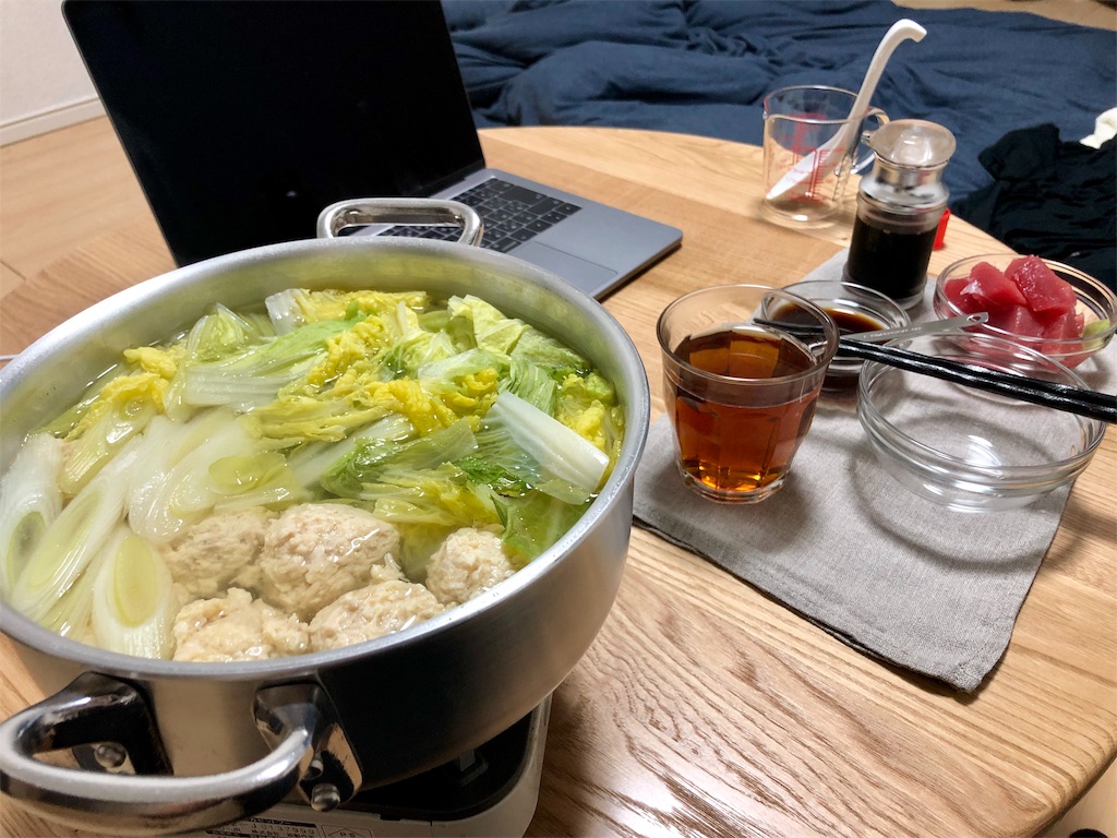 2019-04-24 鳥団子鍋 晩酌 休日出勤代休… 天気が良ければ釣りでもと思っていたが… 雨……日没まで引き篭もって、後は呑むだけ… 身体が何となく野菜を欲している、鍋だな… 暖かい肴に暖かい酒…ん〜旨い…