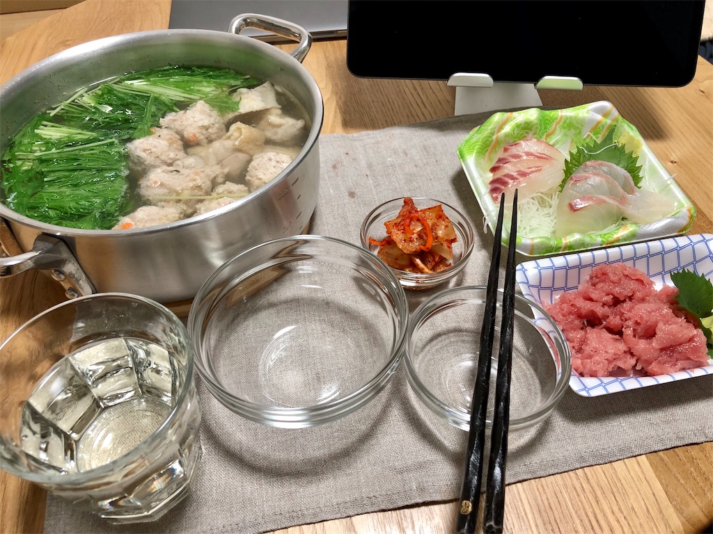 2019-11-20 鳥鍋 晩酌 平日休み… iPhone片手に布団の中でウダウダ、気付けば13時… シャワーを浴びて、クイックルワイパーで部屋を一回り… 後は呑んで寝るだけ… つくねの元と生肉がセットになってる、"鍋用"の肉を買ってみた… 意外と良いかも…