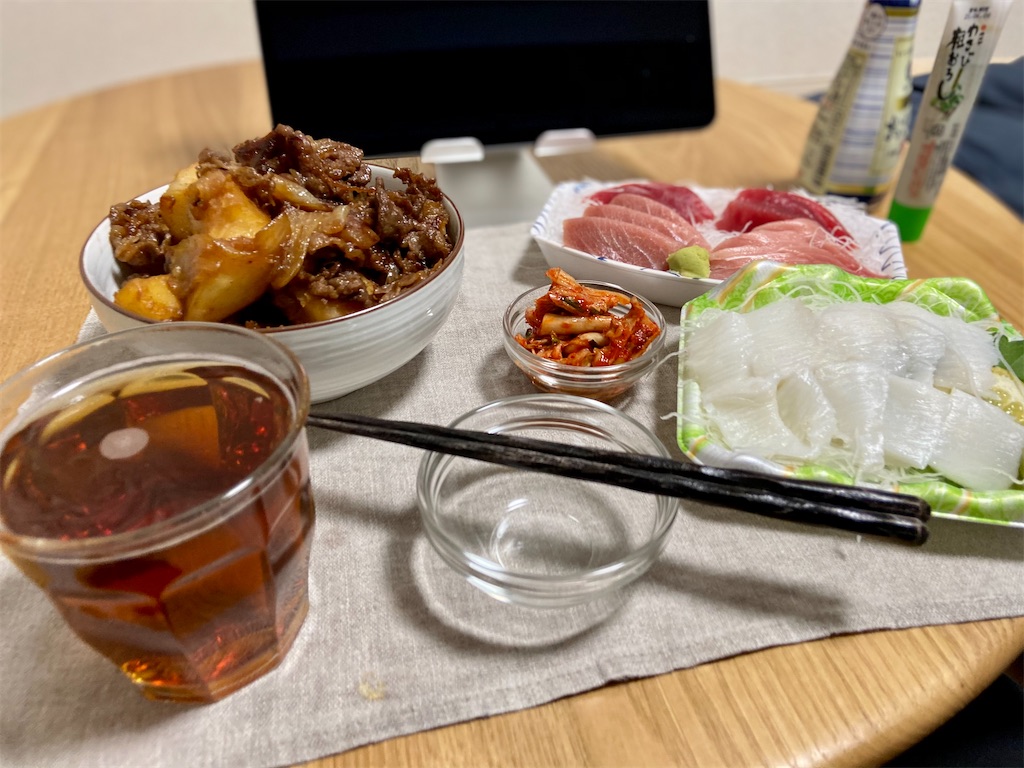 2020-12-02 肉じゃが 晩酌 2020年12月1日(火) 後1ヶ月… 今年の仕事は今年のうちに…無理そうだな。 明日は代休… サービス残業もそこそこにさっさと帰宅、何はともあれ呑みますかね。 酒はホットウーロンハイ… あゝ旨い…。